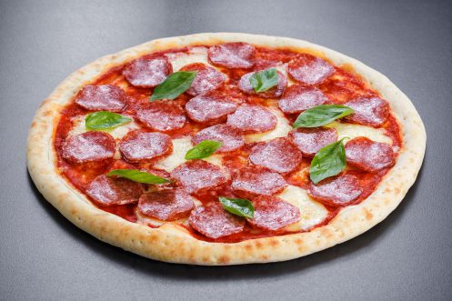 Томатный соус, красный острый перчик, колбаски салями, сыр моцарелла. 33см. итоговый внешний вид может отличаться от фотографий на сайте