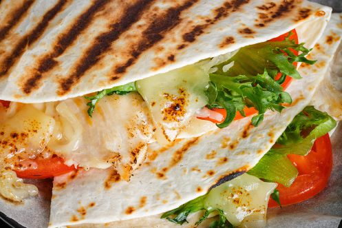 Мексиканская лепёшка-тортилья, сыр, томаты, болгарский перец, курица, томатный соус и сметана. итоговый внешний вид может отличаться от фотографий на сайте