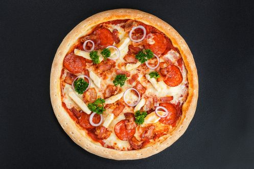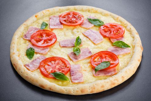Cоус томатный, двойная порция бекона, сыр чеддер, сыр моцарелла, томаты, красный лук, чесночное масло, итальянские травы. итоговый внешний вид может отличаться от фотографий на сайте