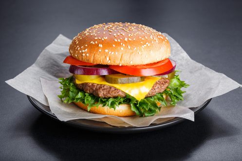 Булочка с кунжутом, бифштекс свинины или говядины, сыр чеддер, маринованные огурчики, лук красный, соус BBQ, томаты, лист салата, горчица. итоговый внешний вид может отличаться от фотографий на сайте