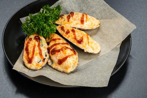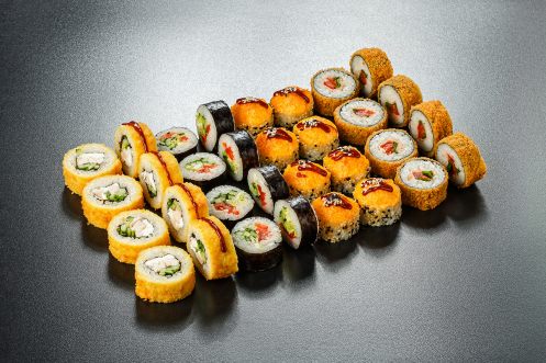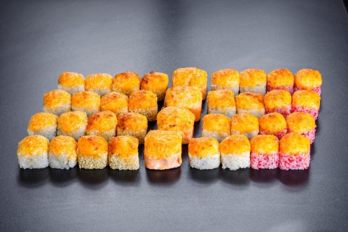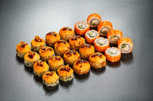 Запеченный с угрем, ролл запеченный с лососем терияки, запеченная чука, запеченная классика, запеченный с грибами 36шт. *Данный сет в акциях и скидках не участвует. Итоговый внешний вид может отличаться от фотографий на сайте.