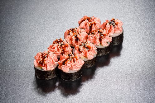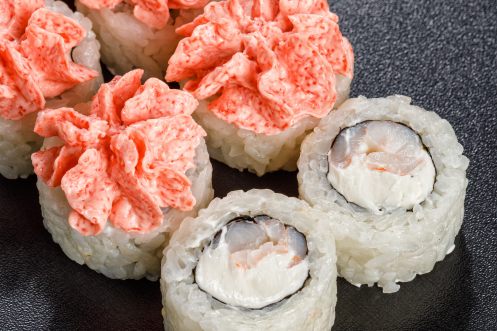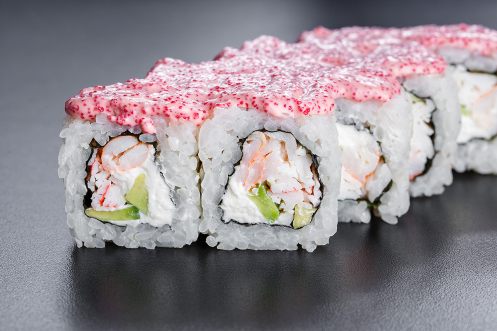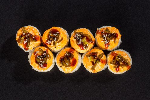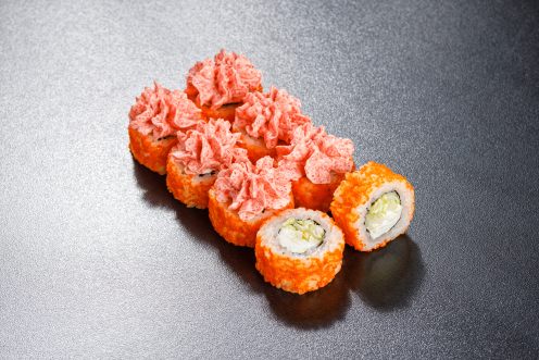 Крем краб, авокадо, тигровая креветка, икра тобико красная, спайс соус, 8шт. итоговый внешний вид может отличаться от фотографий на сайте