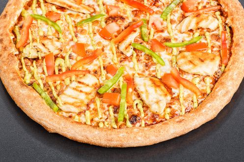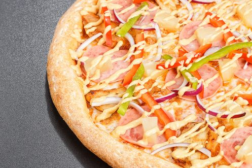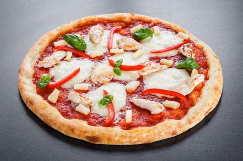Томатный соус, ананасы, перец болгарский, цыпленок, сыр моцарелла. итоговый внешний вид может отличаться от фотографий на сайте