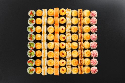 Ролл филадельфия баланс, темпура с курицей, темпура с беконом, ролл краб том ям, ролл веган, ролл с тунцом, ролл хрустим с курицей, ролл терияки, 64 шт. *Данный сет в акциях и скидках не участвует. Итоговый внешний вид может отличаться от фотографий на сайте.
