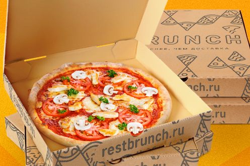 Соус томатный,курочка копченная,томаты, перец болгарский, сыр моцарелла, соус песто. итоговый внешний вид может отличаться от фотографий на сайте