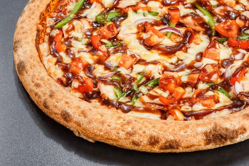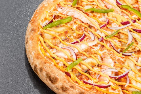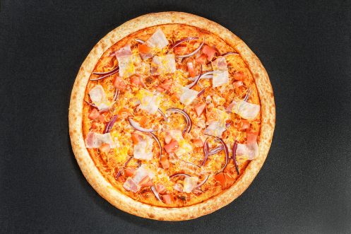 Соус томатный, копченая курочка, красный лук, болгарский перец, томат, сыр Моцарелла, соус Терияки. итоговый внешний вид может отличаться от фотографий на сайте