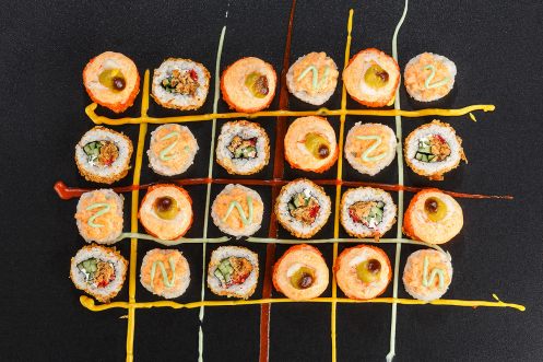 Ролл с курицей в соусе унаги, ролл Веган, ролл запеченный с курицей, темпура с беконом *Данный сет в акциях и скидках не участвует. Итоговый внешний вид может отличаться от фотографий на сайте.