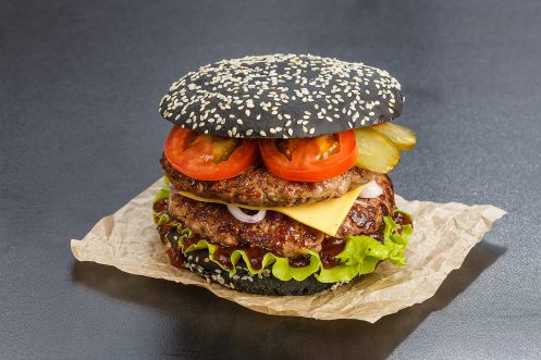 Черная булочка с кунжутом, два бифштекса из свинины или говядины, сыр чеддер, маринованные огурчики, лук красный, соус bbq, салат, томат. итоговый внешний вид может отличаться от фотографий на сайте