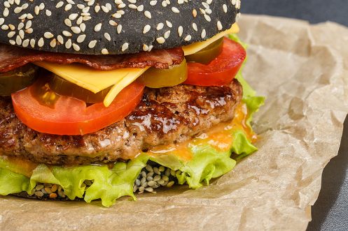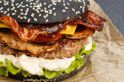 Черная булочка с кунжутом, бифштекс из свинины или говядины, сыр чеддер, соус BBQ, томаты, лист салата, жаренный бекон. итоговый внешний вид может отличаться от фотографий на сайте