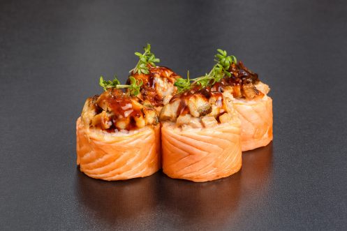 сливочный сыр, лосось, краб, запеченный угорь в соусе манго чили 4 шт. *Данный товар в акциях и скидках не участвует. итоговый внешний вид может отличаться от фотографий на сайте