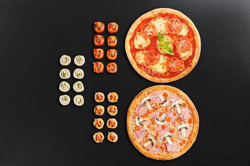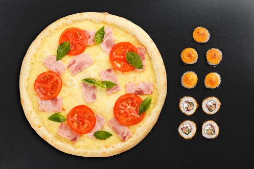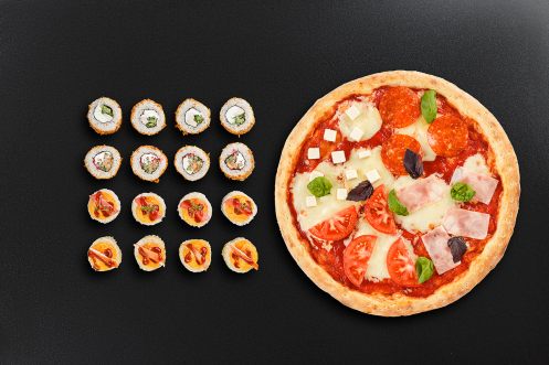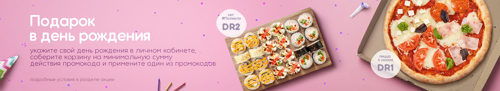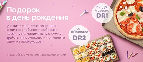 Пицца 4 сезона, ролл хрустим с лососем 4шт, ролл хрустим с курицей 4шт., ролл запеченный с цыпленком гриль 4шт., ролл запеченный с тунцом 4 шт. *Данный Комбо набор в акциях и скидках не участвует. Итоговый внешний вид может отличаться от фотографий на сайте.