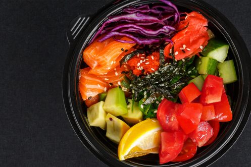 Отварной рис, лосось, авокадо, огурец, салат Хияши Вакаме,лимон, томаты , икра Тобико, соус Унаги, ореховый соус. итоговый внешний вид может отличаться от фотографий на сайте