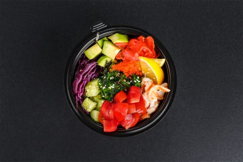 Отварной рис, тигровые креветки, спелое авокадо, огурец, салат Хияши Вакаме,лимон, томаты, икра Тобико, соус Унаги, ореховый соус итоговый внешний вид может отличаться от фотографий на сайте