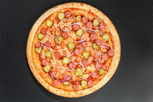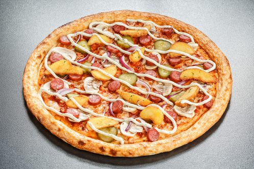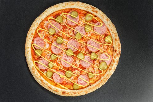 Соус томатный, колбаски охотничьи, красный лук, огурцы маринованные, сыр моцарелла. итоговый внешний вид может отличаться от фотографий на сайте