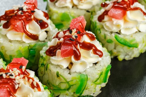 Сливочный сыр, японский омлет, салат Хияши Вакаме, тунец, соус ореховый, кунжут-микс. итоговый внешний вид может отличаться от фотографий на сайте