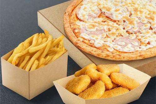 Куриные нагетсы, картофель фри, пицца ветчина и сыр 32 см. *Данный Комбо набор в акциях и скидках не участвует. Итоговый внешний вид может отличаться от фотографий на сайте.